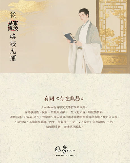 Jonathan 畢業於香港中文大學哲學系,曾涉足出版、廣告、公關及金融等領域,人生起伏精彩。自 2024 年起於 Threads 撰文,曾準確預測香港股市進入戌月即大跌。他以「文人論命」角度探討命理,強調數之必然,精於紫微斗數、金錢卦及風水。